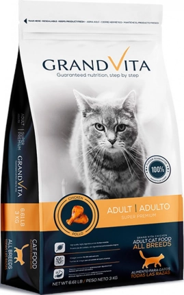 GRAND VITA GATO ADULTO con proteína de pollo de alta calidad, que aporta vitalidad y desarrollo muscular, además de mejorar la digestión y promover piel y pelaje suave y brillante.